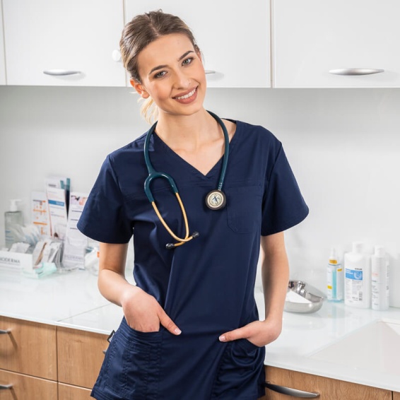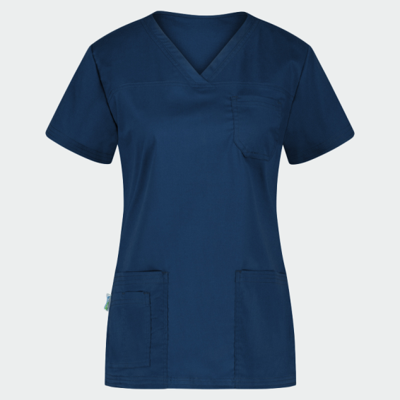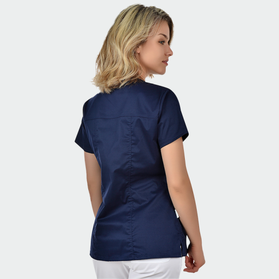 Our scrub top ANDREA is made with triple seams, for greater strength and a modern look. The ratio between polyester, cotton and elastane in the fabric is optimal and allows you to maintain a professional and impeccable appearance 24/7. Developed with care for hospitals, laboratories, pharmacies, hotels, dental clinics, veterinary clinics, dermatology clinics, etc. This scrub top can be combined with DANTE scrub trousers.