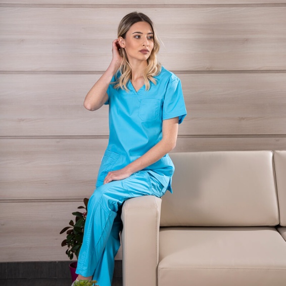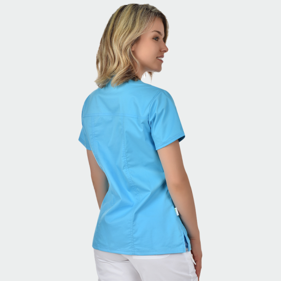 Our scrub top ANDREA is made with triple seams, for greater strength and a modern look. The ratio between polyester, cotton and elastane in the fabric is optimal and allows you to maintain a professional and impeccable appearance 24/7. Developed with care for hospitals, laboratories, pharmacies, hotels, dental clinics, veterinary clinics, dermatology clinics, etc. This scrub top can be combined with DANTE scrub trousers.