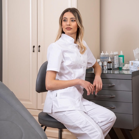Scrub top LISA is made of 63% polyester, 35% cotton and 2% elastane fabric 165g/m². Available in white, pink, and navy blue. It is mainly worn in hospitals, medical centers, dental offices, but it can also be used in the hotel industry, hairdressing, and beauty salons. With the LISA scrub top from b-well, it is certain that you will always look elegant and presentable at work. The scrub top can be combined with DANTE scrub trousers.