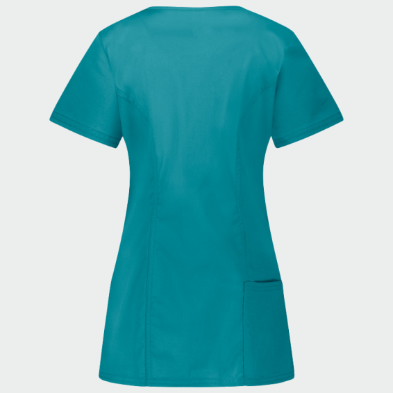 - Two lower side pockets, the right one continuing into the back of the scrub top