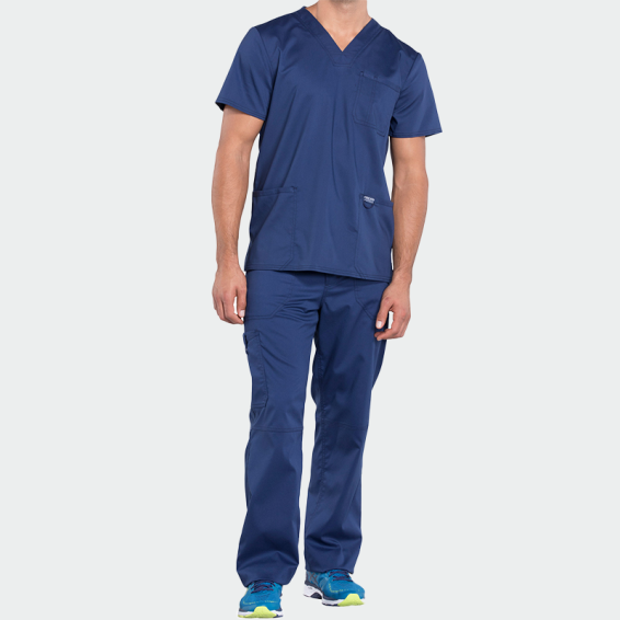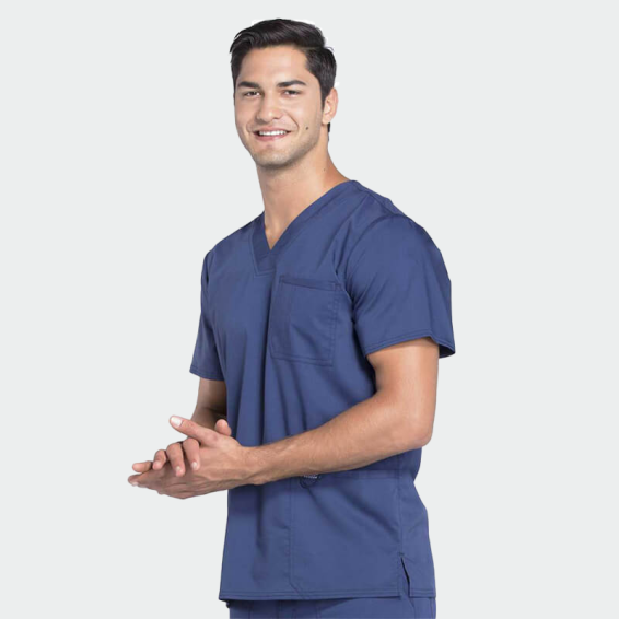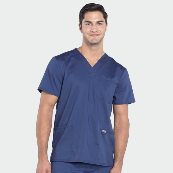 CHEROKEE scrub top REVOLUTION WWE670 is a men's work scrub top made of polyester, viscose, and elastane.