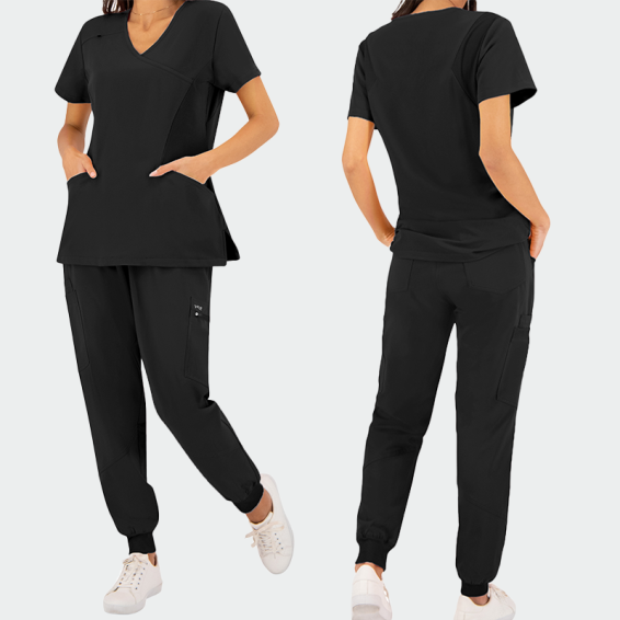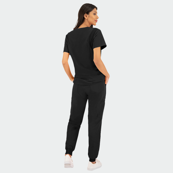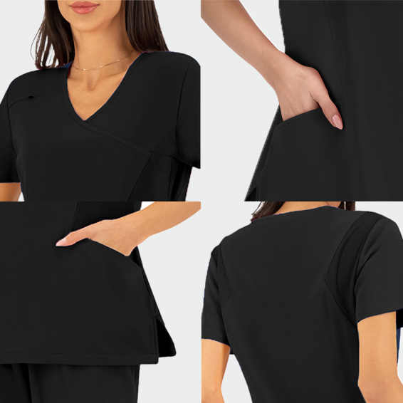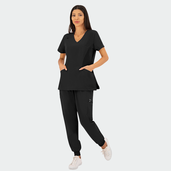 Scrub top JUSTINA is made of ethereal material, a combination of polyester, viscose and elastane. The modern cut with an added polyester snap makes it easy to wear and extremely gentle when touching the skin. The scrub top is suitable for the daily work of doctors, nurses, dentists, pharmacists, veterinarians, medical personnel, workers and employees in aesthetic centers.