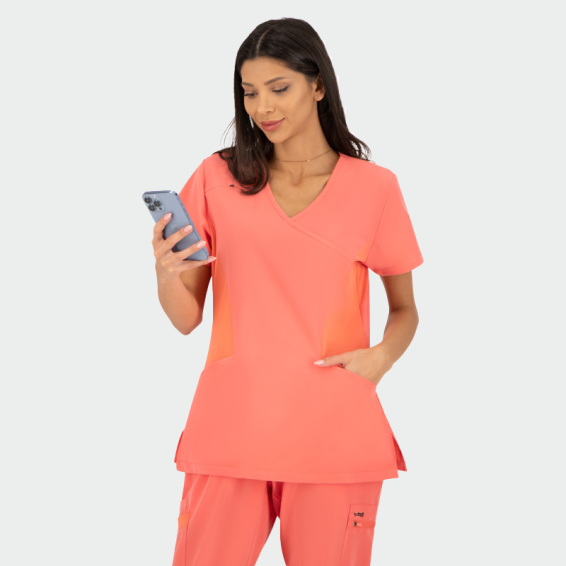 Scrub top JUSTINA is a new model, elegant, women's scrub top of the B-well brand with a modern and stylish design, fitted silhouette and ethereal fabric. It is made of 72% polyester, 21% viscose and 7% elastane with a fabric density of 200g/m², making it the ideal medical garment.