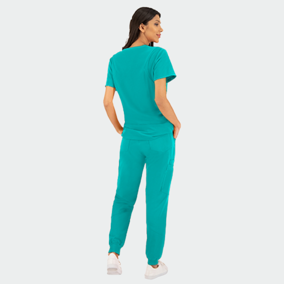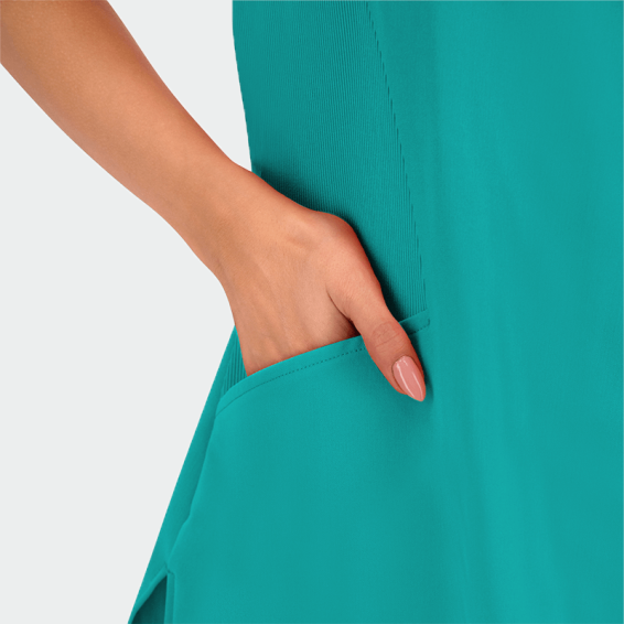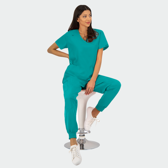 Scrub top JUSTINA is made of ethereal material, a combination of polyester, viscose and elastane. The modern cut with an added polyester snap makes it easy to wear and extremely gentle when touching the skin. The scrub top is suitable for the daily work of doctors, nurses, dentists, pharmacists, veterinarians, medical personnel, workers and employees in aesthetic centers.