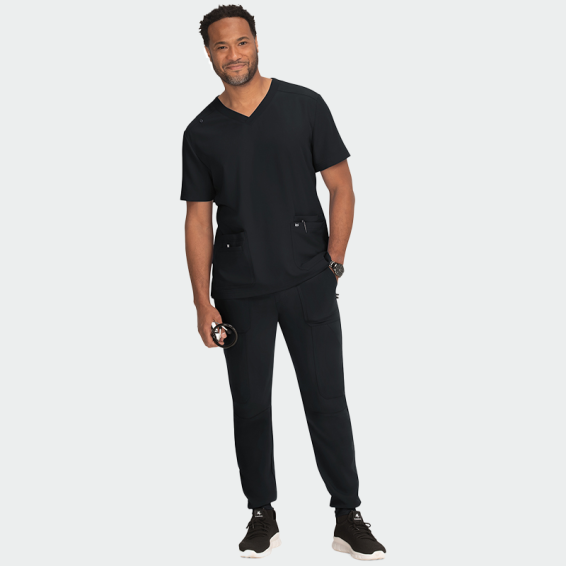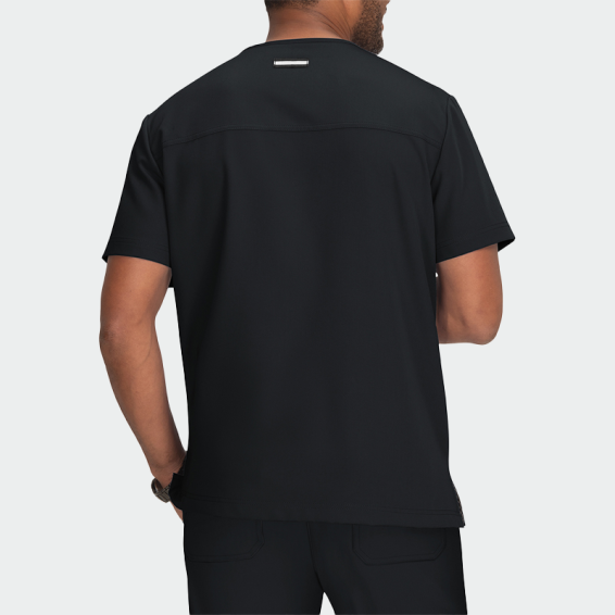 The NEXT GEN 672 medical scrub top by KOI is a men's tunic made from lightweight fabric, composed of polyester, viscose, and elastane.