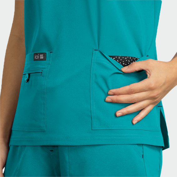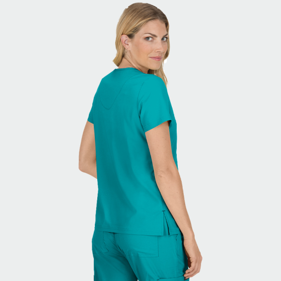 The BASICS 373 medical Scrub top by KOI is an elegant women's tunic with a fitted silhouette, modern design, and lightweight fabric. Made from 95% polyester and 5% elastane, the airy material prevents sweating and resists wrinkling during washing.
