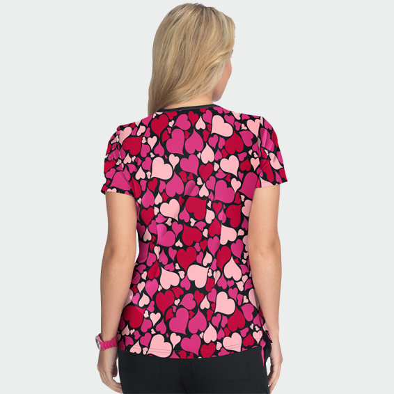 The medical scrub top FRENCH BULL F100PR-FHT by KOI is an elegant, women's scrub made of airy fabric with a modern floral print.