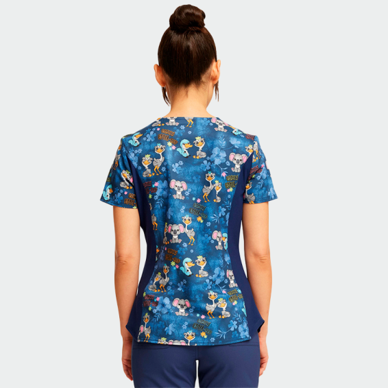 fitted silhouette, a V-neckline and a trendy giraffe-animated floral