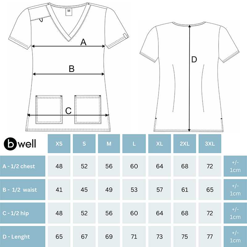 The ISABELLA medical tunic is a new elegant women's model from the B-well brand, featuring a modern and stylish design. It is made from 94% polyester and 6% elastane with a fabric weight of 170 g/m², making it the ideal choice for medical workwear.
