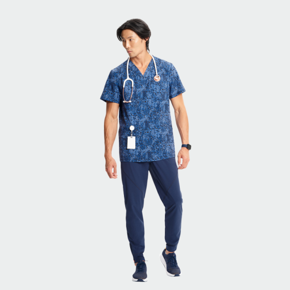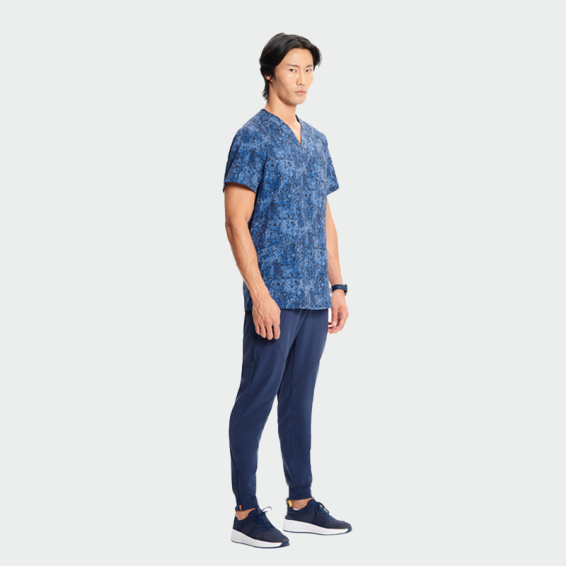 CHEROKEE brand INFINITY CK920 scrub top is a men's work tunic made of recycled polyester, polyester and elastane.