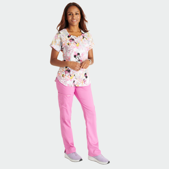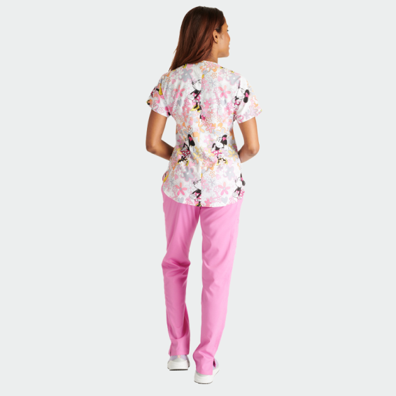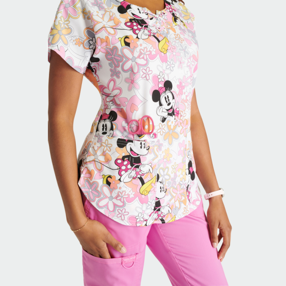fitted silhouette, V-neck and trendy colorful Mickey Mouse print. It is