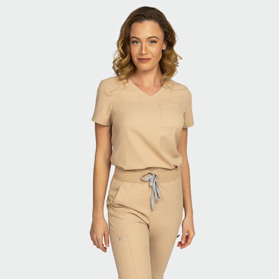 With its sharp neckline, elegant silhouette, upper pocket, and badge loop, the tunic offers both functionality and style. This design seamlessly blends practicality with professionalism, highlighting your personal style in the workplace.