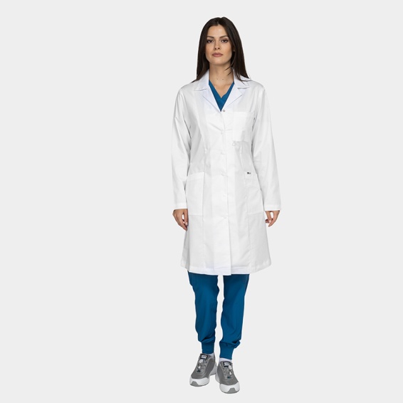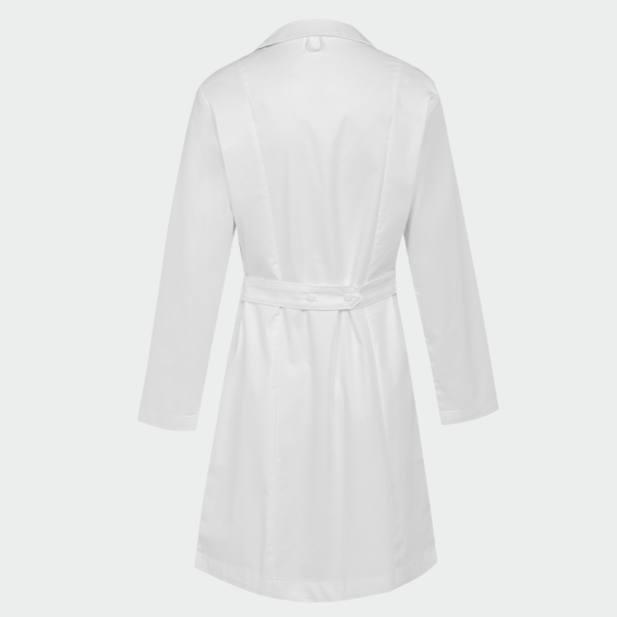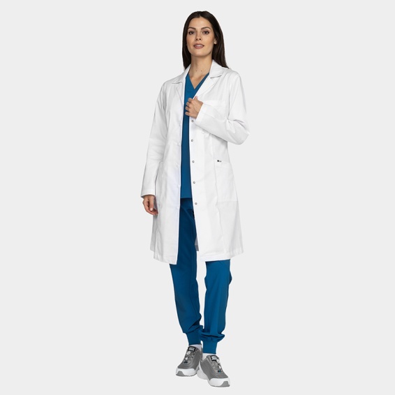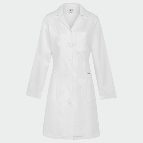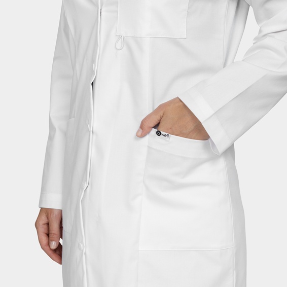 The VALERIA women's medical coat is a fitted white lab coat with snap buttons by Bwell, featuring CL 60°C technology for maintaining a bright white color.