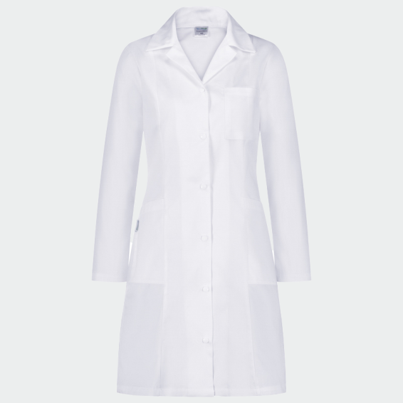 women's medical coat VALERIA is a white, fitted coat with snap button
