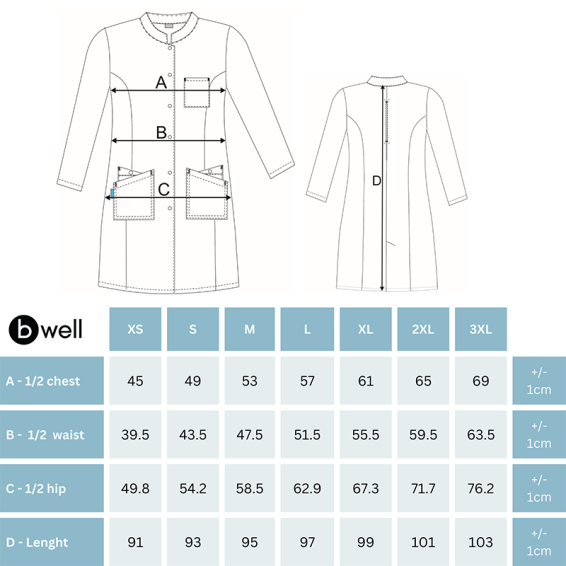 B-well medical coat MILA is a women's fitted gown made of cotton and polyester in white color.