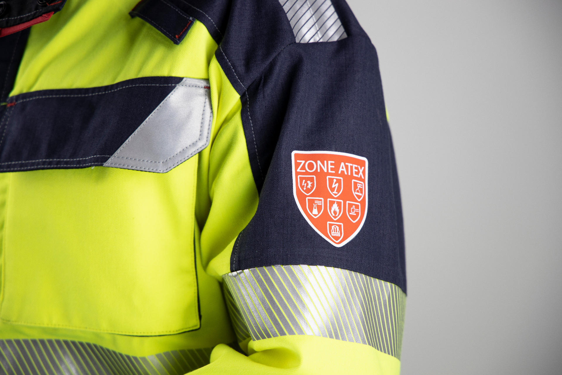 sewn reflective tapes + segmented transfer tapes - ATEX area transfer on left sleeve - Reflective