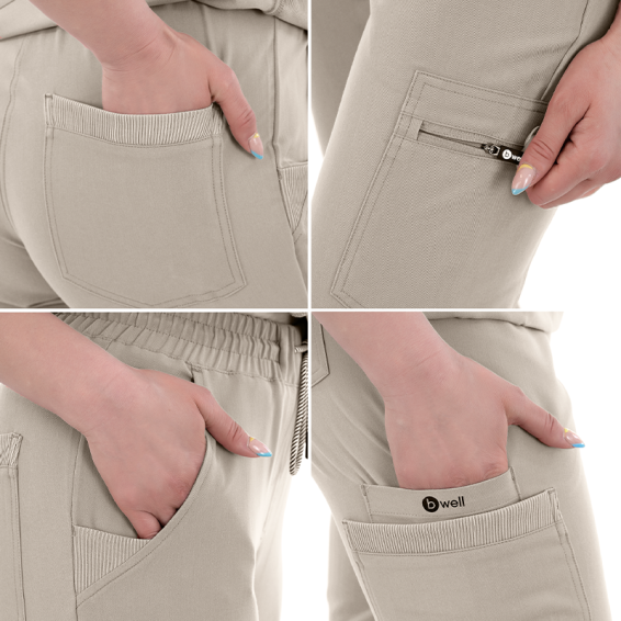 The RICCI medical pants are a new top model from the B-well brand. These unisex pants are made from a lightweight fabric—a combination of polyester, viscose, and elastane.