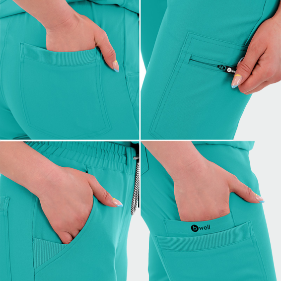 The RICCI medical pants are a new top model from the B-well brand. These unisex pants are made from a lightweight fabric—a combination of polyester, viscose, and elastane.