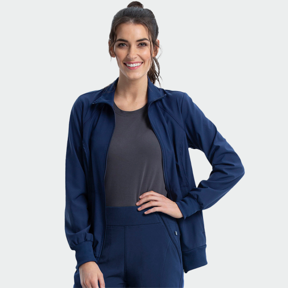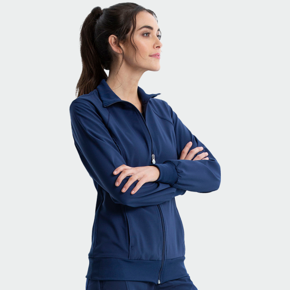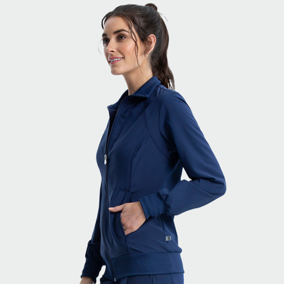 Modern scrub jacket with a zip is an elegant CHEROKEE brand, with two front pockets with a zipper closure. The back panel, collar, cuffs and waistband are made in a stretch rib knit for extra comfort. It is made of 95% polyester and 5% elastane with a density of 175g/m².