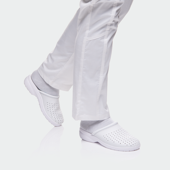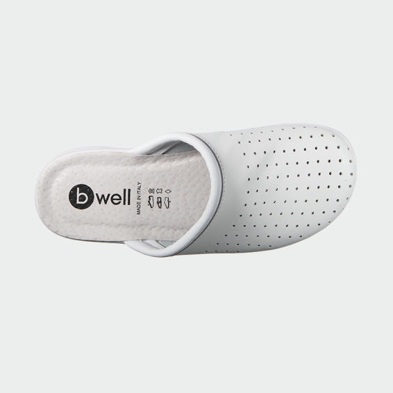 B-well AERIAL Lady medical slippers are made of genuine leather in the front part. The sole is anti-slip from polyurethane, and the insole with an energy absorber in the heel area. Our medical slippers have a modern design in white color, and are light and comfortable throughout the work process.
