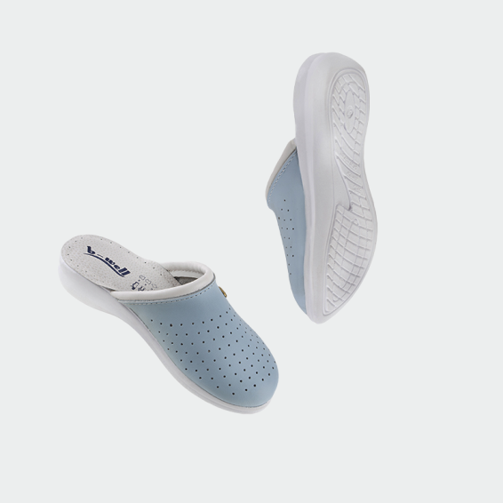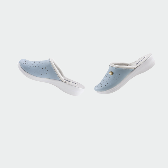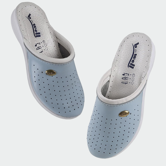 B-well AERIAL Lady medical slippers are made of genuine leather in the front part. The sole is anti-slip from polyurethane, and the insole with an energy absorber in the heel area. Our medical slippers have a modern design in white color, and are light and comfortable throughout the work process.