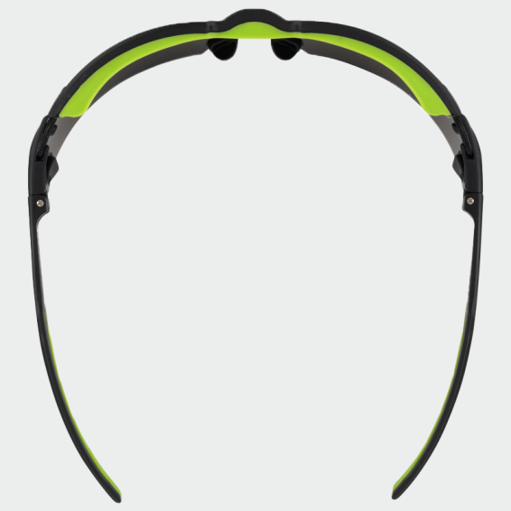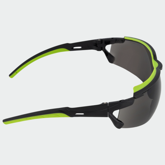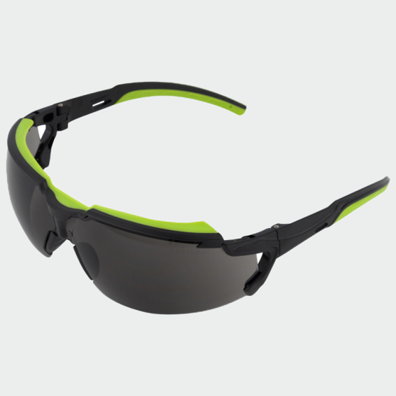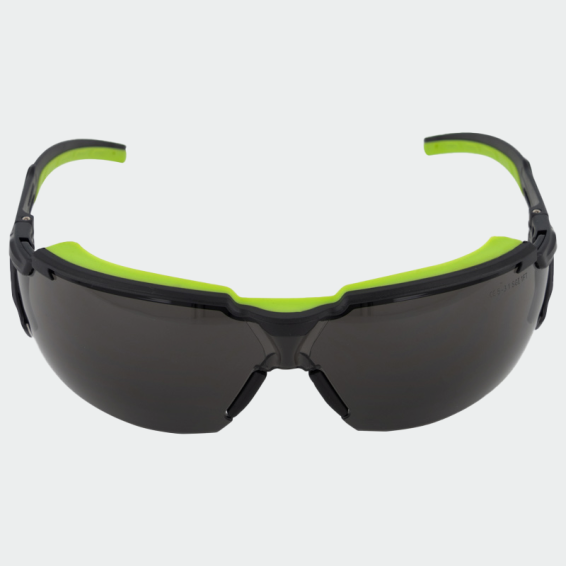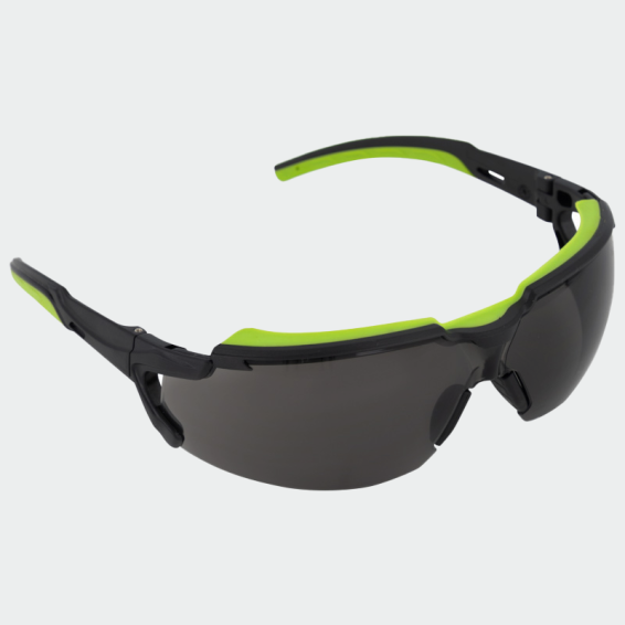Safety glasses with dark lenses, made from high quality polycarbonate and thermoplastic rubber.